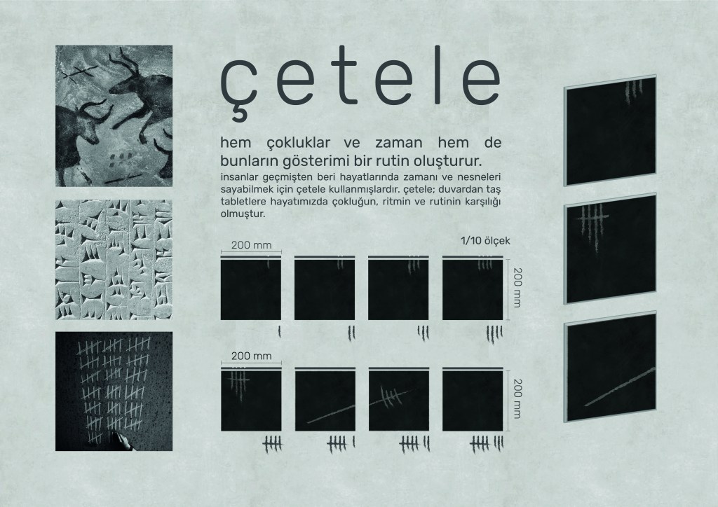 Counting time is necessary to know, recognize, and understand both the past and the future. This design aims to reflect that act of counting. Each ceramic piece shows either a full tally chart or a few elements of it. Using relief, the notched marks found in tally charts have been deepened, designed in a way that evokes cuneiform script.