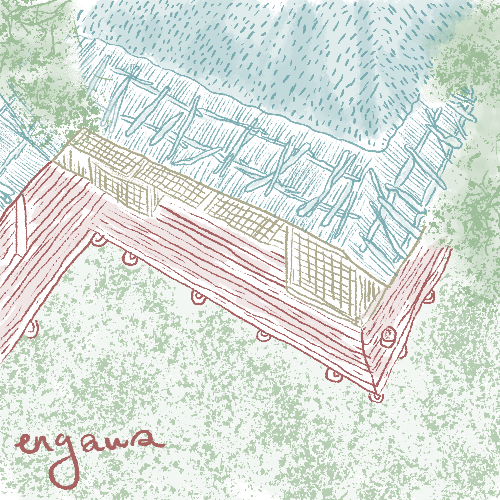 “a strip of decking, often finished in wood or bamboo, that exist between the periphery of the Japanese house and the garden, covered by the part of eaves that extend from the moya.” 1