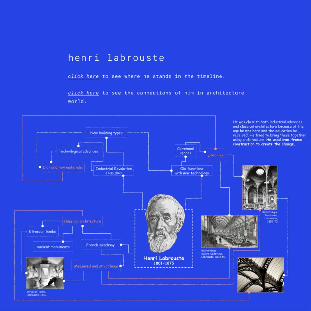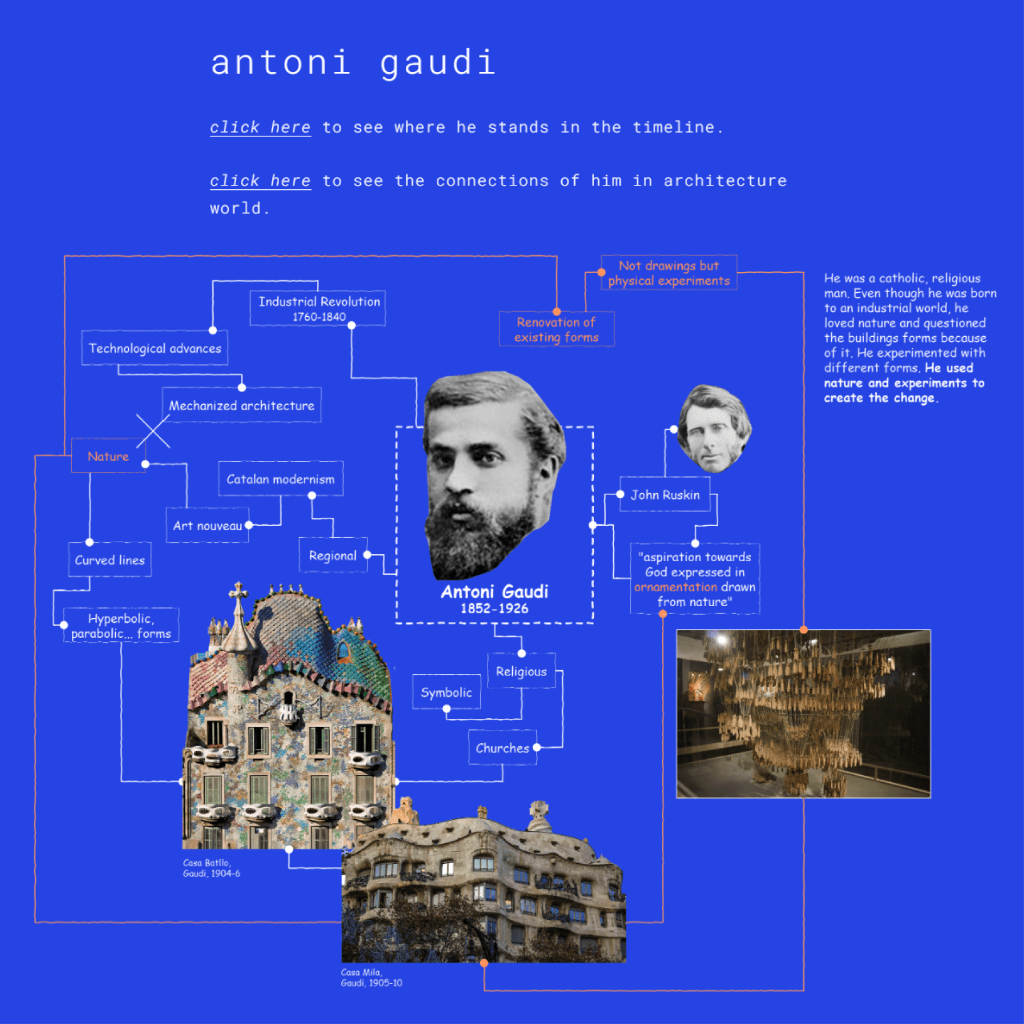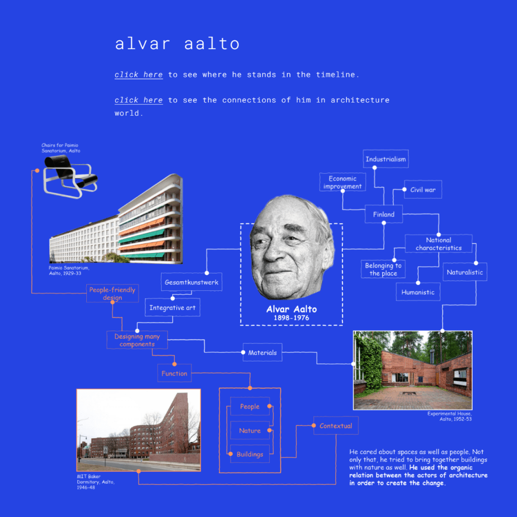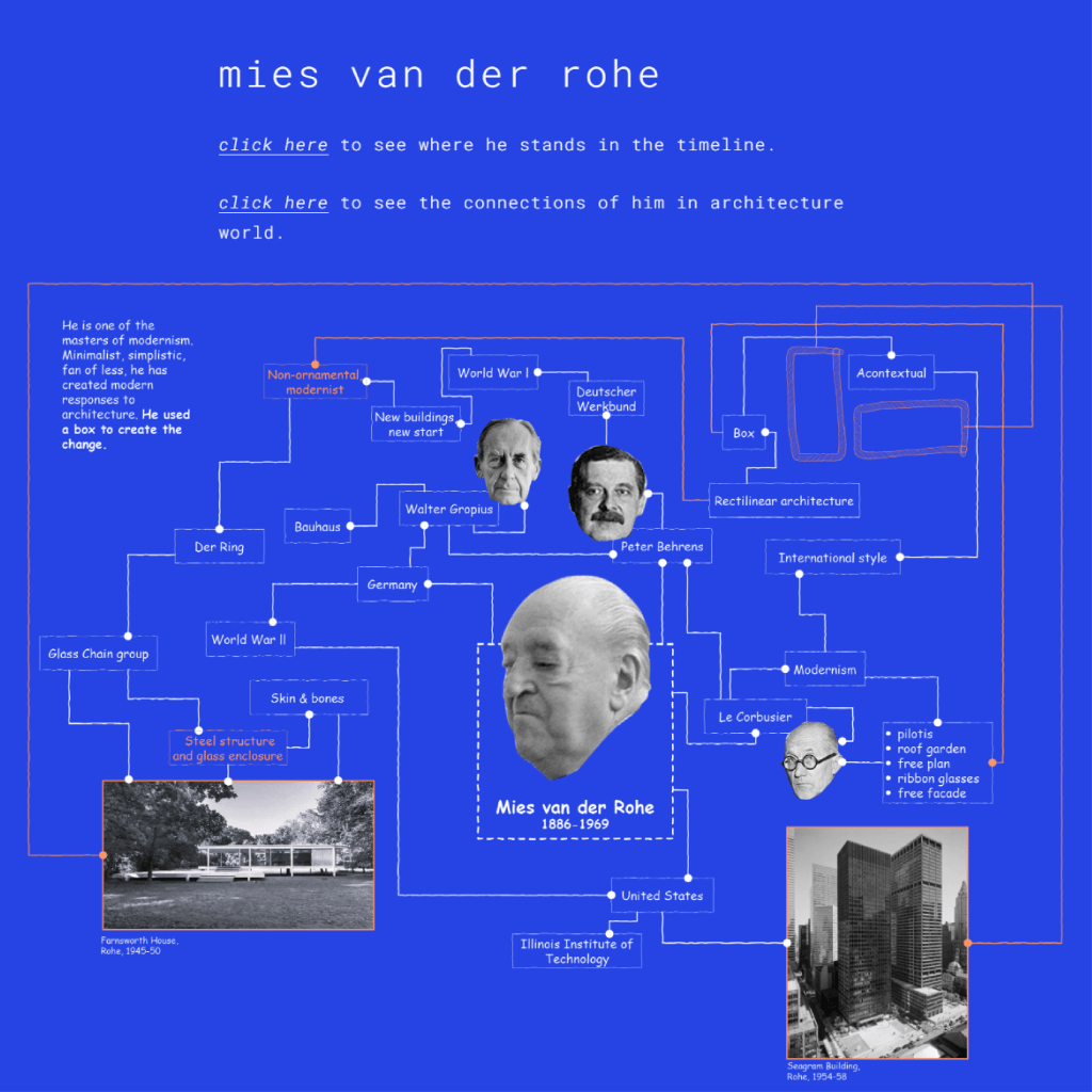 First one is the timeline. There, you can see 10 architects chosen in the chronological order. When you click to the link icon next to their faces, you can see the detailed mind maps of every architect and this is the second (there is 10 of them) main page.